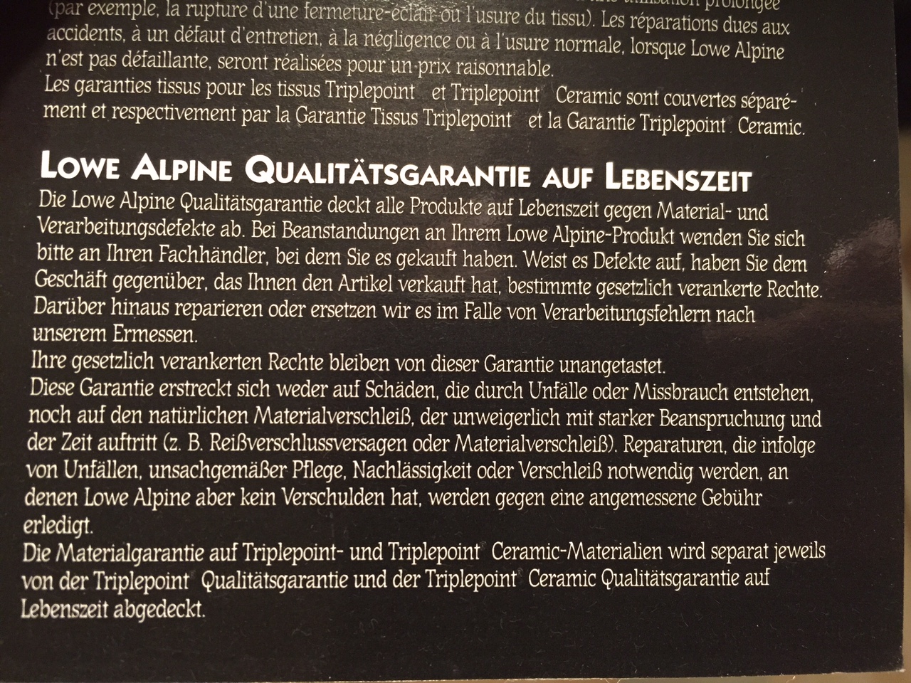 In den beim Kauf gültigen Garantiebedingungen („Lowe Apline Qualitätsgarantie auf Lebenszeit“) stand also, dass die Garantie sich „weder auf Schäden, die durch Unfälle oder Missbrauch entstehen, noch auf den natürlichen Materialverschleiß, der unweigerlich mit starker Beanspruchung UND der Zeit auftritt (z. B. Reißverschlussversagen oder Materialverschleiß)“ erstreckt (Hervorhebung durch mich). (Ich finde, dass Materialverschleiß ein gutes Beispiel für natürlichen Materialverschleiß ist. Da haben die sich damals echt Mühe gegeben, mit ihren Ausschlusskriterien.)